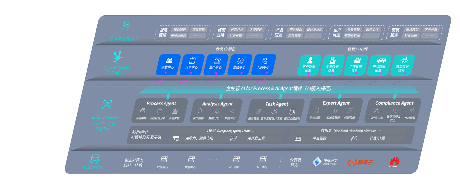 端到端的一站式AI工作空间深度融合了从企业战略规划到日常经营的全流程业务板块,,定向解决车企内部领域多、、部门多、、、、链条长、、、、场景碎片化等难题,,,,支持车企快速构建以AI为核心的生产力写作体系,,,实现任务执行与AI能力的无缝集成与交互
