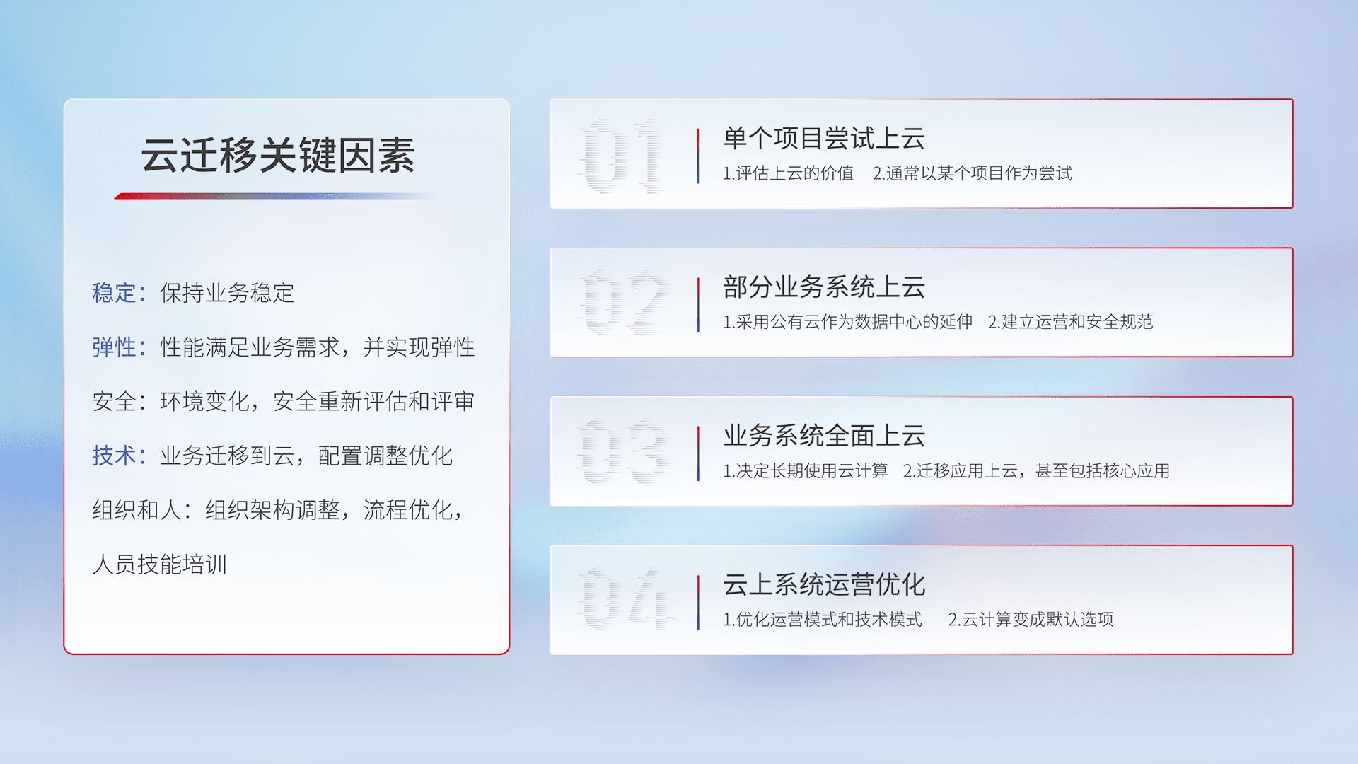 结合实际业务,,,,从规划设计、、、、云平台选型、、、、云原生改造、、、、数据迁移、、、集成交付,,,,迁移全过程为客户识别最佳上云路径,,,做好风险识别管理,,,,设计网络架构、、、、身份权限、、、、安全审计合规、、、、操作审计、、、日志审计、、、、监控告警策略、、、多站点容灾设计等,,对云上基础设施进行整体规划,,,,提升IT治理水平,,,,以满足弹性、、高可用、、高性能的需求。。