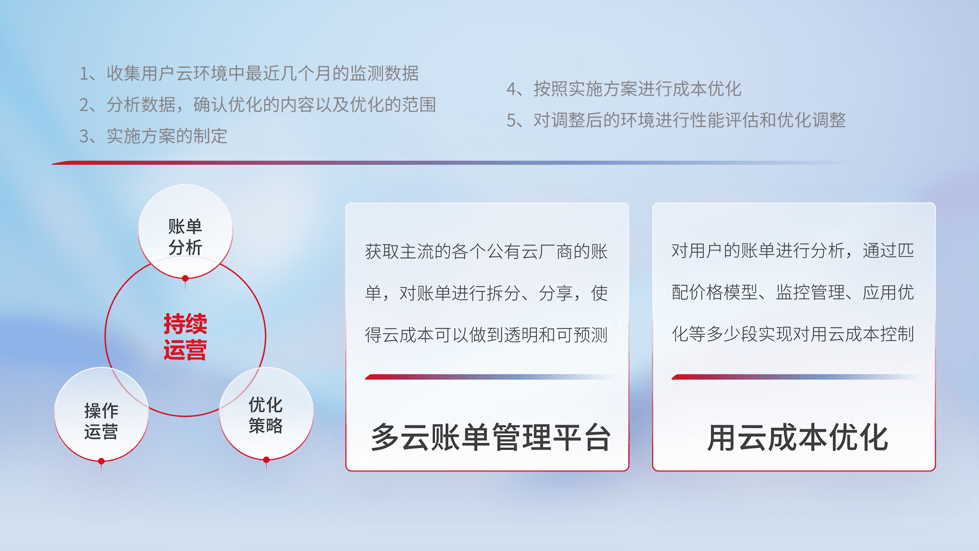 通过多云纳管,,,,以统一的资源数据模型把客户的云资源进行抽象和封装,,,,进而实现对多云资源的统一操作,,保障云资源管理的可靠性、、、、稳定性与可用性。。。。量身定制化运维内容,,配置、、、开发运维、、、补丁管理、、备份、、监控、、认证和访问管理、、、审计和日常巡检等,,保障在用云过程中的可靠度,,,稳定度以及高可用率。。。